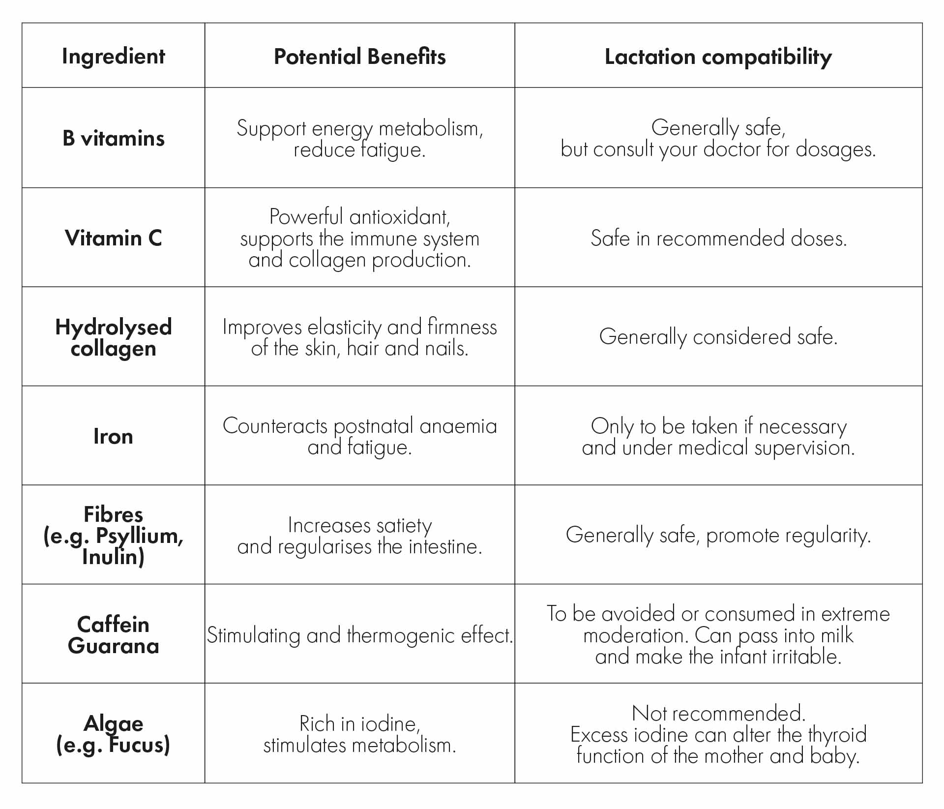 Below is a table summarising the characteristics of some common ingredients in supplements, with a focus on their safety in lactation.